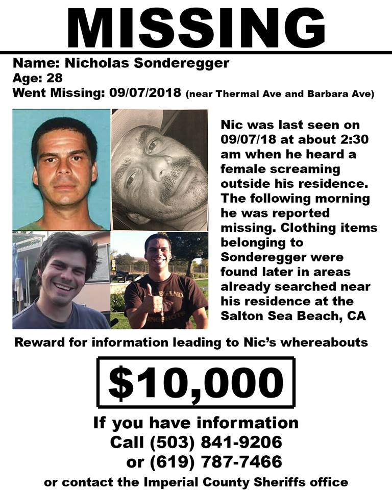 Nic was last seen on 09/07/2018 at around 2:30 AM when he heard a female screaming outside his residence at Salton Sea Beach, California. The following morning he was reported missing. Clothing items belonging to Nic were found later in areas already searched near his residence.